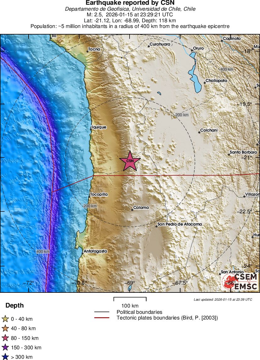 | 2.5 | 117.8 | 6685 | 00:29 | Link | Geringer Erdbeben - TARAPACA, CHILE - Heute |