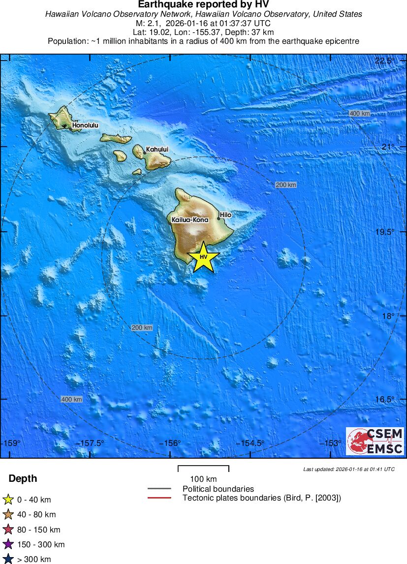 | 2.1 | 37.3 | 7377 | 02:37 | Link | Geringer Erdbeben - ISLAND OF HAWAII, HAWAII - Heute |